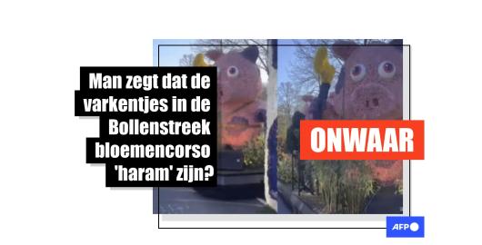 Afbeelding Gepubliceerd op 29/04/2026 Op deze video is te zien hoe een man tijdens het bloemencorso in de Bollenstreek over zonlicht praat, niet dat varkens 'haram' zijn