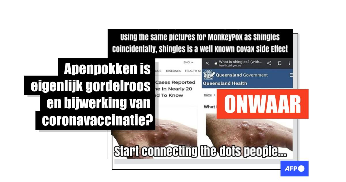 Het bericht bevat een afbeelding met een vergelijkbare bewering in het Engels, met daaronder screenshots van twee verschillende artikelen, beide met dezelfde foto van bultjes op een hand. De eerste screenshot toont een artikel over apenpokken (monkeypox) door het in India gevestigde TheHealthSite.com. De tweede screenshot toont een artikel over gordelroos door Queensland Health, de openbare gezondheidsdienst in die Australische staat.
