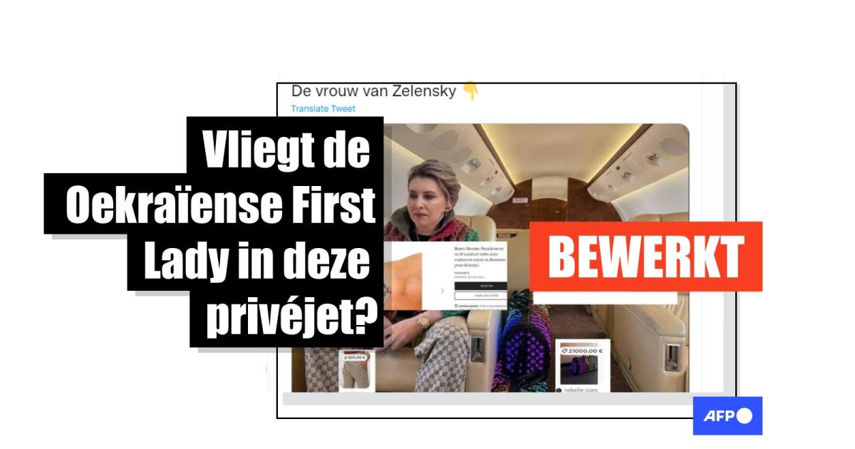 Op de valse foto die tientallen keren in het Nederlands is gedeeld, zou de vrouw van de Oekraïense president, Olena Zelenska, in een privéjet zitten. De foto toont ook infoboxen van de verschillende accessoires en kleding die Zelenska zou dragen.