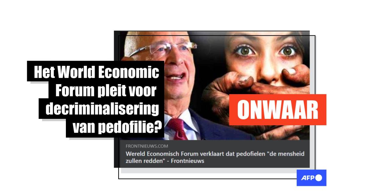 "Het World Economic Forum roept nu op tot het decriminaliseren van seks met kinderen, met de bewering dat wetten tegen 'liefde in de leeftijdskloof ', beter bekend als pedofilie, 'de mensenrechten schenden'," beweert een artikel in het Nederlands dat op 4 januari 2023 is gepubliceerd en honderden keren is gedeeld op Facebook en Twitter.