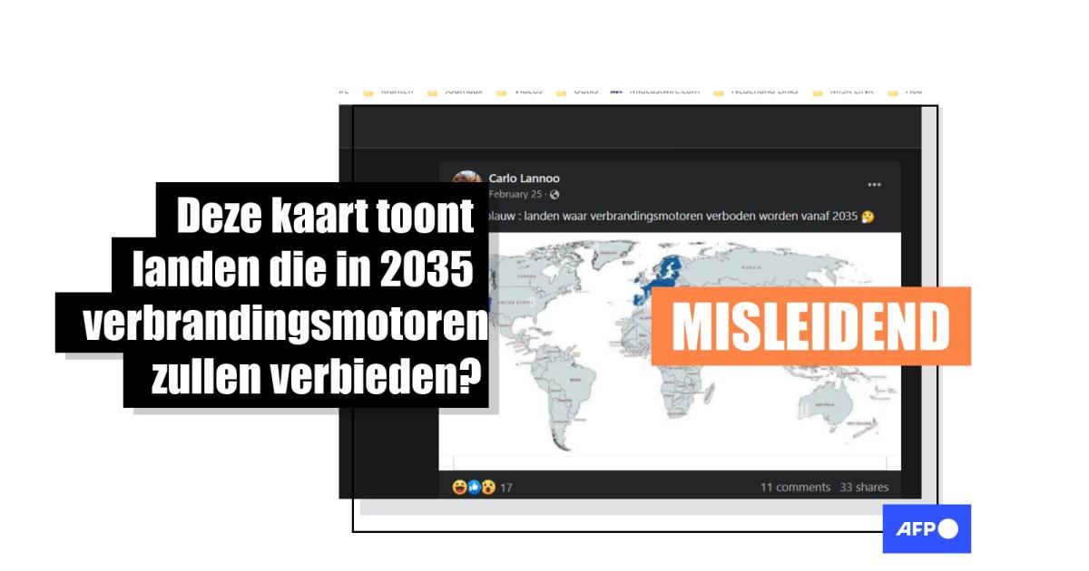 Dezelfde kaart is meer dan honderd keer gedeeld op Facebook samen met het bericht: "In het blauw : landen waar verbrandingsmotoren verboden worden vanaf 2035."