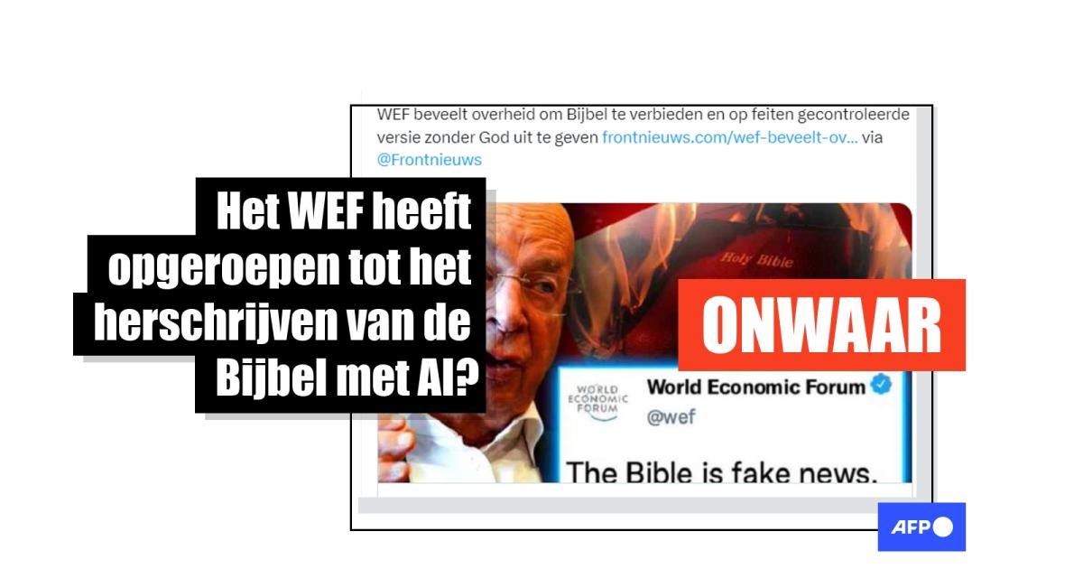 "WEF beveelt overheid om Bijbel te verbieden en op feiten gecontroleerde versie zonder God uit te geven", luidt de titel van een artikel op Frontnieuws, dat verwijst naar The People's voice als bron. Het artikel is sinds half juni meer dan 500 honderd keer gedeeld op Facebook. AFP heeft valse beweringen van beide websites die bekend staan om het verspreiden van desinformatie al vaker geverifieerd, onder andere hier, hier, hier en hier.