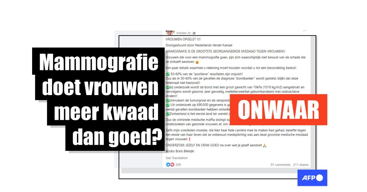Tientallen berichten worden in het Nederlands op Facebook (hier, hier en hier) gedeeld waarin wordt vermeld dat mammografieën schadelijk zijn voor vrouwen en waarin wordt beweerd dat de meeste resultaten die positief zijn voor kanker fout zijn; dat het onderzoek zelf de groei van tumoren stimuleert; dat gezonde vrouwen kanker kunnen krijgen na een mammografie; en dat Zwitserland het eerste land ter wereld is dat deze onderzoeken verbiedt.