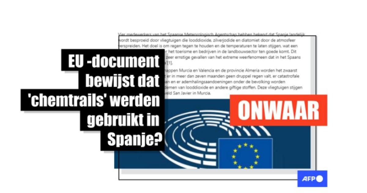 Eind oktober 2024 werd Spanje getroffen door verwoestende overstromingen die al snel werden bestempeld als de dodelijkste natuurramp in de recente geschiedenis van het land. Kort daarna werden verschillende socialemediaberichten gedeeld waarin werd beweerd dat vier medewerkers van het Spaanse Meteorologisch Agentschap (AEMET) hadden bekend dat het land werd besproeid met zogenaamde chemtrails dat het extreme weerfenomeen 'gota fría', dat de overstromingen veroorzaakte, verergerde. Om de bewering te staven verwezen de socialemediagebruikers naar een vraag van een Europees parlementslid over een rapport dat zou zijn ingediend in 2015. De Europese Commissie en AEMET ontkenden echter al eerder het bestaan van een dergelijk rapport en AFP kon er geen gegevens over terugvinden. Experts hebben het bestaan van chemtrails al meermaals ontkracht.