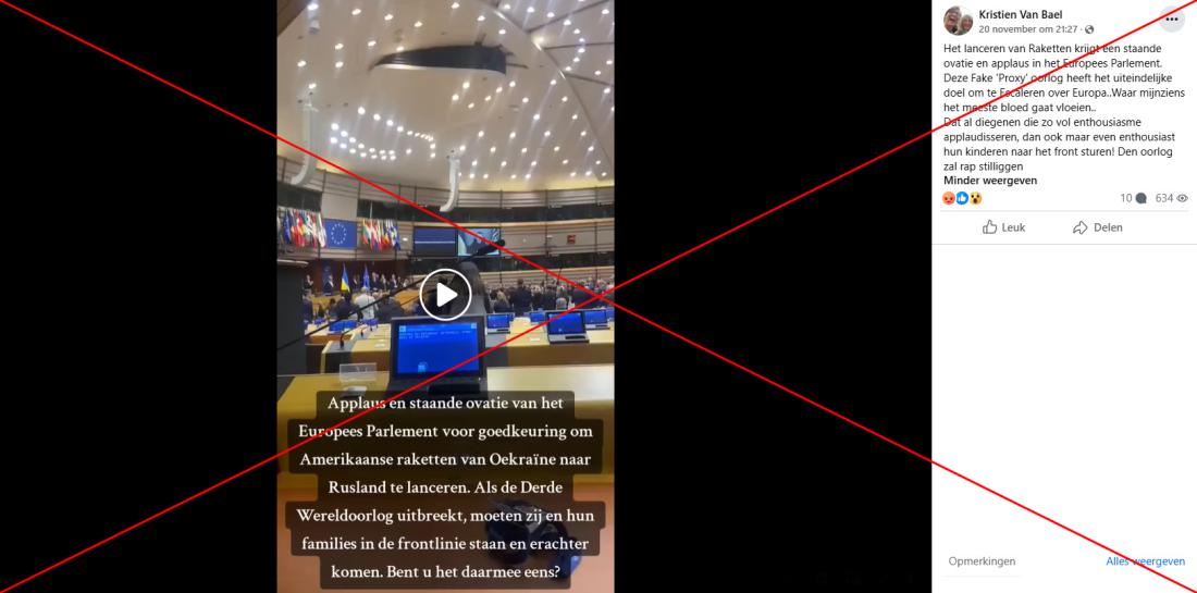 "Applaus en staande ovatie van het Europees Parlement voor de goedkeuring om Amerikaanse raketten vanuit Oekraïne naar Rusland te lanceren. Als de Derde Wereldoorlog uitbreekt, moeten zij en hun families in de frontlinies staan," luidt de beschrijving van een video die in november 2024 door meerdere socialemediagebruikers op Facebook werd gedeeld. De video toont leden van het Europees Parlement die klappen en juichen, terwijl de Oekraïense president Volodymyr Zelensky te zien is op een scherm.