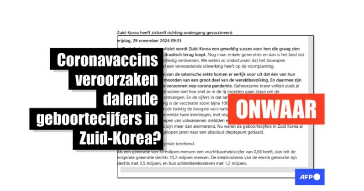"Zuid-Korea heeft zichzelf richting de ondergang gevaccineerd," schreef een socialemediagebruiker op 29 november 2024 op Facebook. "Bij volwassenen is de vaccinatiegraad bijna 100 procent," voegde hij eraan toe. "We weten zo ondertussen dat het biowapen 'coronavaccin' wereldwijd een verwoestende uitwerking heeft op de voortplanting."
