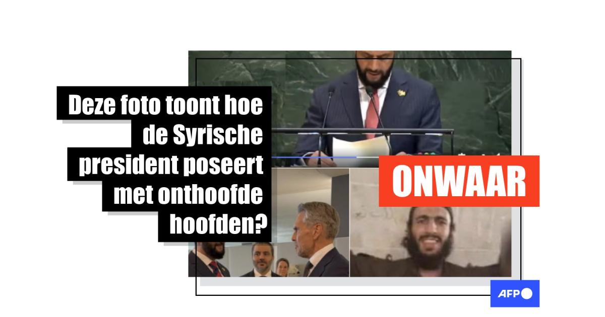 "Hier loopt Dick Schoof handjes mee te schudden?" luidt het bijschrift van een Facebookbericht dat op 29 september 2025 werd gepubliceerd en waarin twee foto's werden gedeeld: één van de Syrische president Sharaa en één van een bebaarde man die glimlacht terwijl hij in elke hand een afgehakt hoofd vasthoudt. De hoofden zijn op de foto wazig gemaakt. De post is een van de vele die op sociale media circuleerden en waarin Schoof werd bekritiseerd vanwege een ontmoeting met Sharaa in de marge van de jaarlijkse Algemene Vergadering van de VN. "Al Jolani - voorheen druk met het onthoofden van hoofden - nu in cosplay als de president van Syrië, handen schuddend met Dick Schoof bij de VN", schreef een andere socialemediagebruiker, verwijzend naar de vroegere nom de guerre van Sharaa, met een foto erbij waarop Schoof en Sharaa elkaar de hand schudden.