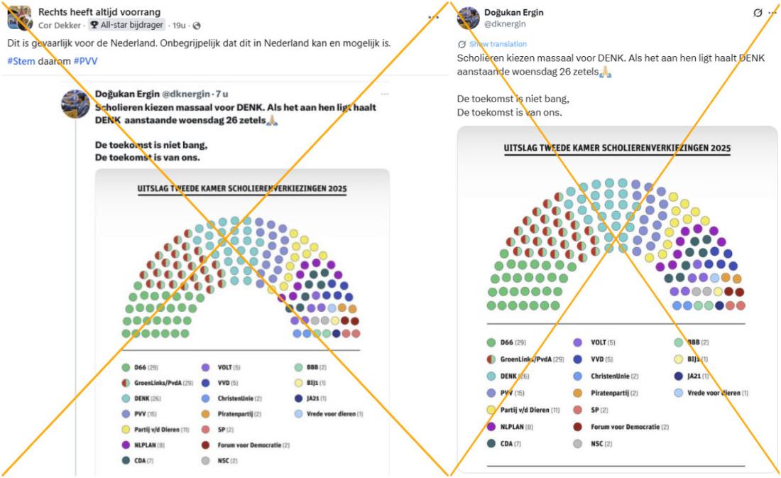 De Scholierenverkiezingen peilen elke Tweede Kamerverkiezingen de stemvoorkeur van vo-scholieren en mbo-studenten. DENK-kamerlid Doğukan Ergin plaatste een paar dagen voor de Tweede Kamerverkiezing in oktober 2025 een misleidend bericht op X waarin hij beweerde dat scholieren "massaal" voor zijn partij kozen. Maar de grafiek met de zogezegde zetelverdeling die Ergin deelde, is afkomstig van slechts één school in Utrecht. De nationale uitslag van de Scholierenverkiezing wordt pas op 28 oktober bekendgemaakt. Hoewel Ergin onder de tweet verduidelijkte dat de grafiek alleen betrekking had op één school, ging de bewering een eigen leven leiden op sociale media.