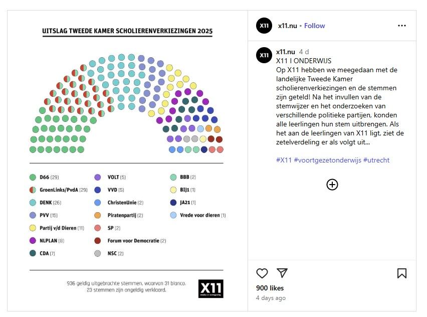 Hoewel Ergin in zijn eerste post een algemeen beeld lijkt te schetsen dat het om alle Nederlandse scholieren zou gaan, verduidelijkt hij in een tweede tweet dat het gaat om de uitslag van de X11 school in Utrecht. De zetelverdeling werd door de school zelf online geplaatst op Instagram. In de post van Ergin en in die van andere socialemediagebruikers werd extra informatie, zoals het logo van de school en het aantal uitgebrachte stemmen, uit het beeld geknipt.