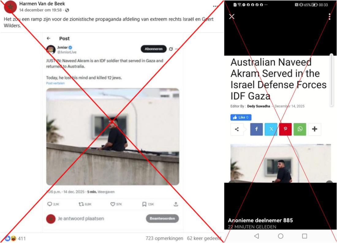 "Het zou een ramp zijn voor de zionistische propaganda afdeling van extreem rechts Israël en Geert Wilders", schreef een Nederlandse Facebook-gebruiker op 14 december 2025, op dezelfde dag als de aanslag, naast een screenshot van een bericht met het Engelse bijschrift "JUST IN: Naveed Akram is een IDF-soldaat die in Gaza heeft gediend".
