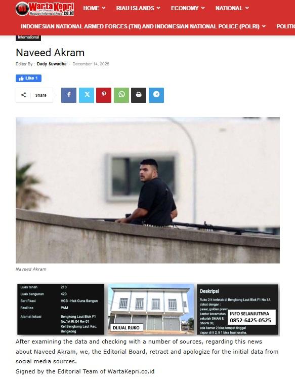 Op de livepagina waar het artikel stond, publiceerde de nieuwssite een verklaring en excuses: Na het controleren van de gegevens en het raadplegen van een aantal bronnen met betrekking tot het nieuws over Naveed Akram, trekken wij, de redactie, de oorspronkelijke informatie uit sociale mediabronnen in en bieden wij onze excuses aan. Ondertekend, de redactie van WartaKepri.co.id