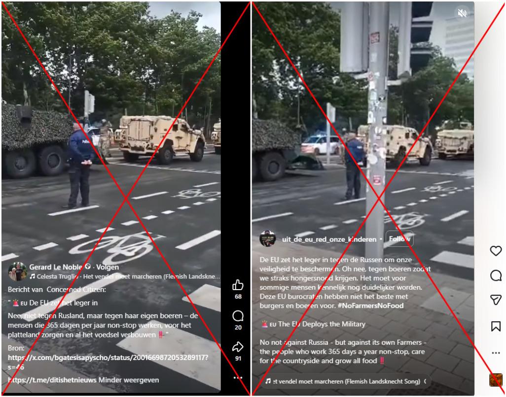 Op 18 december 2025 stroomden duizenden boeren naar de Belgische hoofdstad om te protesteren tegen de ondertekening van een handelsakkoord tussen de EU en het Zuid-Amerikaanse blok Mercosur. Tegen deze achtergrond circuleerde in België en Nederland een video waarin een konvooi van militaire voertuigen in de straten van Brussel te zien was, met de ongegronde bewering dat de "EU het leger had ingezet" tegen de boeren. De video dateert echter uit de zomer van 2025, toen het jaarlijkse militaire defilé werd gehouden op de Belgische nationale feestdag.