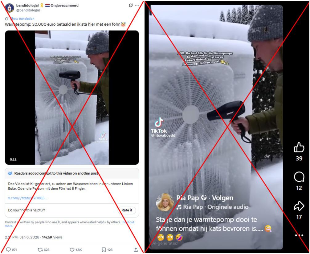 "Warmtepomp: 30.000 euro betaald en ik sta hier met een föhn", schreef een Nederlandse socialemediagebruiker op 6 januari 2026 op X, naast een video van een man die probeert de buitenunit van een warmtepomp te ontdooien met een haardroger. De video werd meer dan 600 keer gedeeld.