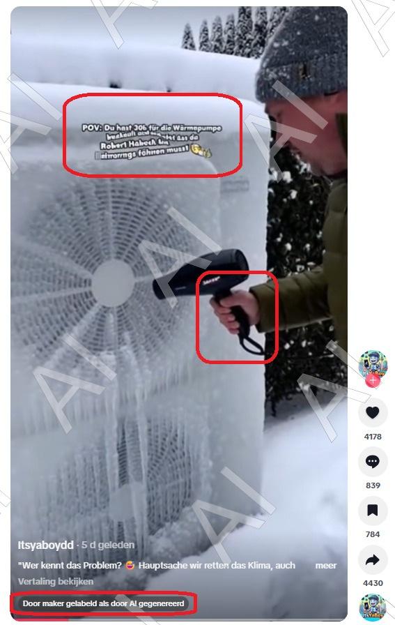 Op de video die door de Nederlandse accounts wordt gedeeld, is een TikTok-gebruikersnaam (@itsyaboydd) zichtbaar die over het scherm zweeft. Dit leidt ons naar de originele video die in het Duits op TikTok werd geplaatst. De TikTok-video heeft een duidelijk zichtbaar label onderaan de video dat aangeeft dat deze door kunstmatige intelligentie is gegenereerd. In de video's die in het Nederlands circuleren, is het label ook zichtbaar in de linkerbenedenhoek.