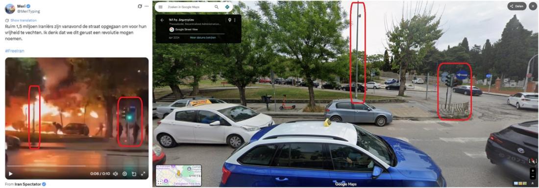 Op basis van deze informatie heeft AFP de exacte locatie bepaald waar de video is opgenomen. Op Google Streetview zien we hetzelfde type hek, verkeerslichten en dezelfde straathoek.