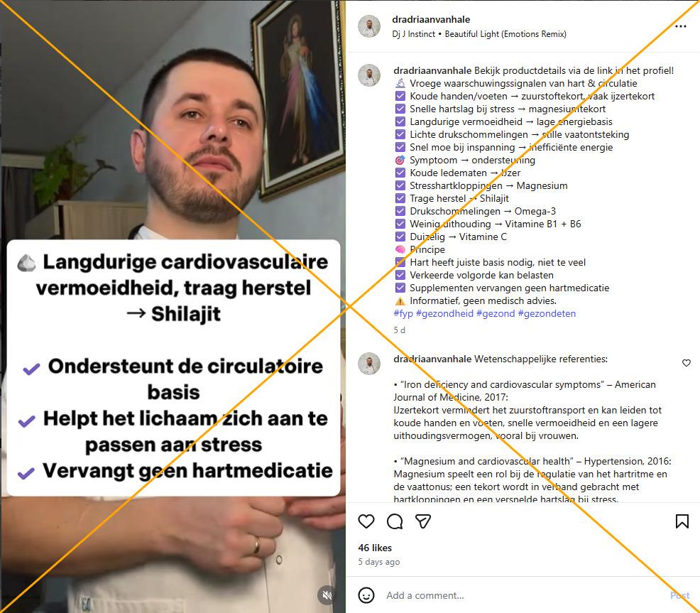 "Langdurige cardiovasculaire vermoeidheid en traag herstel? Neem Shilajit", luidt het bijschrift van een van de vele video's die werden geplaatst door het socialemedia-account van "Dr. Adriaan Van Hale". In deze filmpjes raadt de persoon die zich voordoet als "Dr. Van Hale" shilajit-supplementen aan voor een breed scala aan aandoeningen: haaruitval, huidbehandelingen, vermoeidheid, een betere bloedcirculatie en een hoger libido.