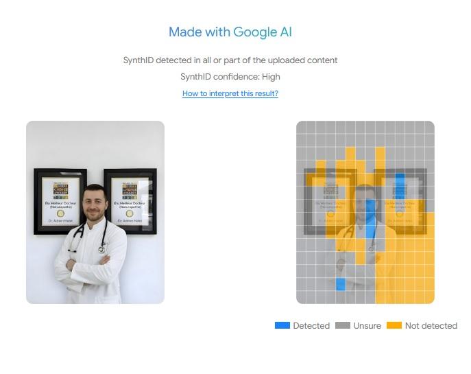 We analyseerden de afbeelding van de vermeende arts ook met de SynthID-detectietool van Google en ontdekten dat deze werd gemaakt met behulp van Google AI. SynthID is een onzichtbaar watermerk dat wordt toegevoegd aan producten die zijn gemaakt met Google AI.