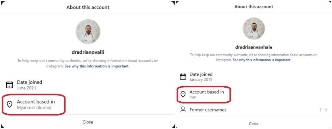 In de details van het Instagram-account wordt ook aangegeven dat de eigenaar waarschijnlijk vanuit Iran opereert. De gebruikersnaam werd sinds de aanmaak in 2019 al zeven keer gewijzigd. De gewijzigde gebruikersnamen zijn echter niet zichtbaar. Bij het Italiaanse account zien we dat het beheerd wordt vanuit Myanmar.