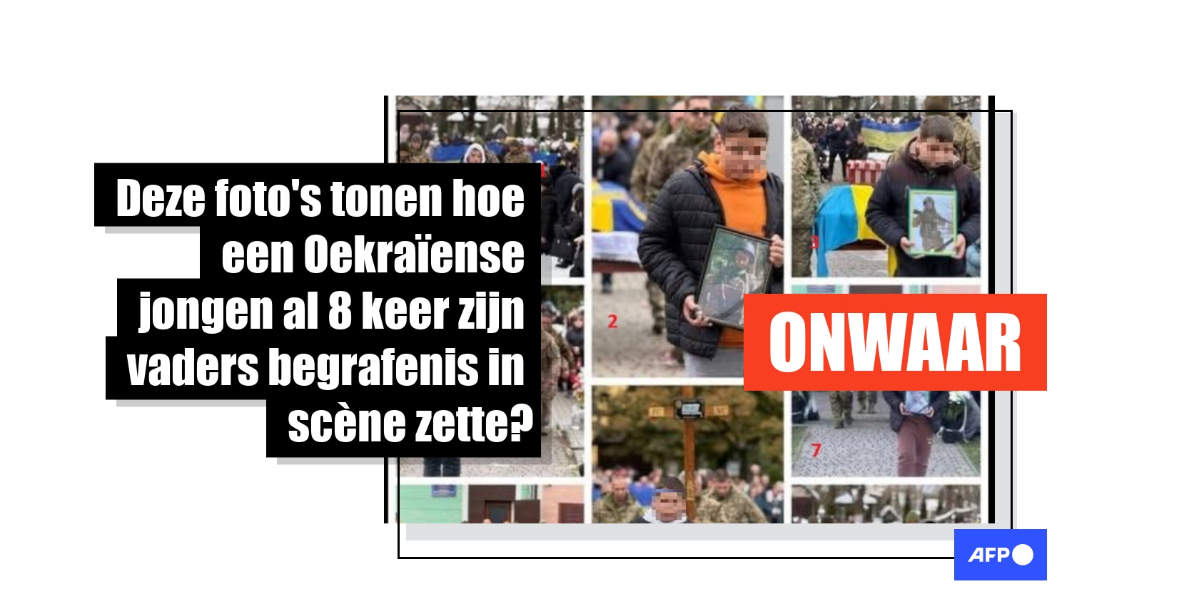 "Wat zielig, dit Oekraïense jongetje heeft al acht keer zijn vader verloren in enkele maanden. En zo worden we voor de gek gehouden", luidde een bericht op X op 10 februari, dat meer dan 1000 keer werd gedeeld. Het bericht ging vergezeld van een fotocompilatie waarop dezelfde tiener te zien is bij acht verschillende begrafenissen, waar hij een portret van de overledene draagt.