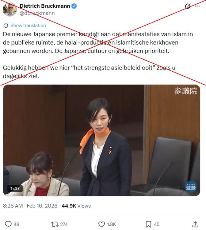 "De nieuwe Japanse premier kondigt aan dat manifestaties van de islam in de publieke ruimte, de halal-productie en islamitische kerkhoven gebannen worden. De Japanse cultuur en gebruiken prioriteit", luidt het bijschrift van een bericht dat op 16 februari 2026 op X werd geplaatst. Naast het bericht delen gebruikers ook een clip van twee minuten waarin een Japanse politica een toespraak houdt tijdens een debat.