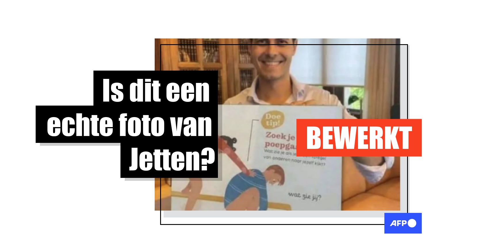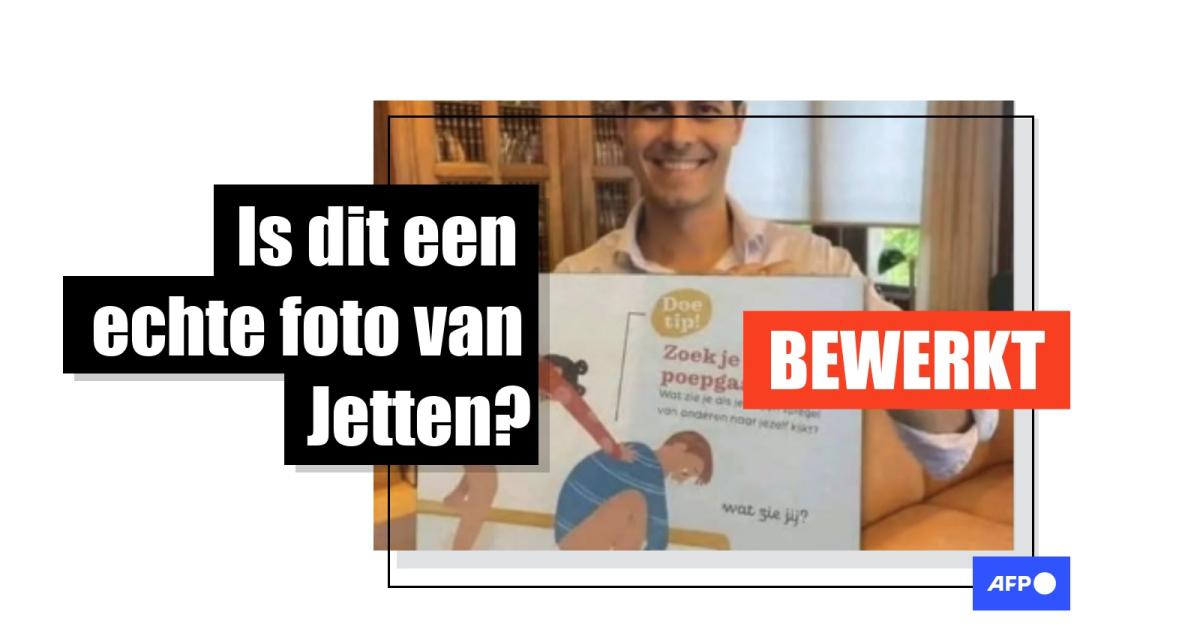 Een omgekeerde zoekopdracht met de afbeelding toont echter al snel aan dat de foto niet echt is. De originele foto is afkomstig van Jettens Facebook-pagina en toont hoe hij drie boeken vasthoudt op 4 juni 2021 in het kader van de Nationale Boekenweek. Die stapel boeken werd in de manipulatie vervangen door een opengeslagen pagina met de tekst "Zoek je eigen poepgaatje."