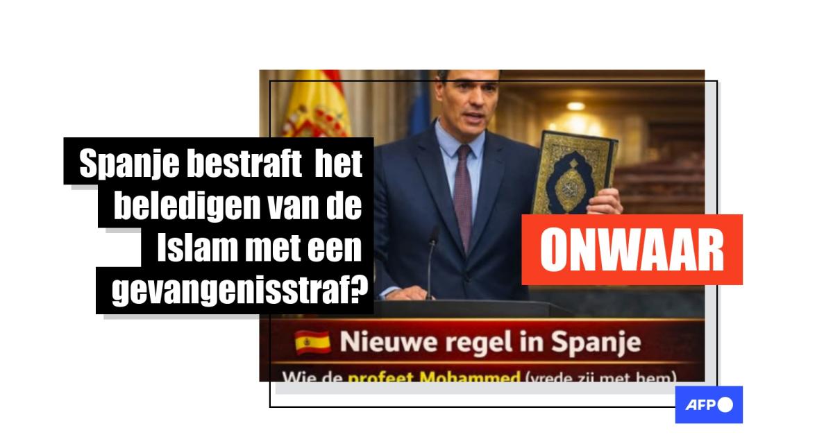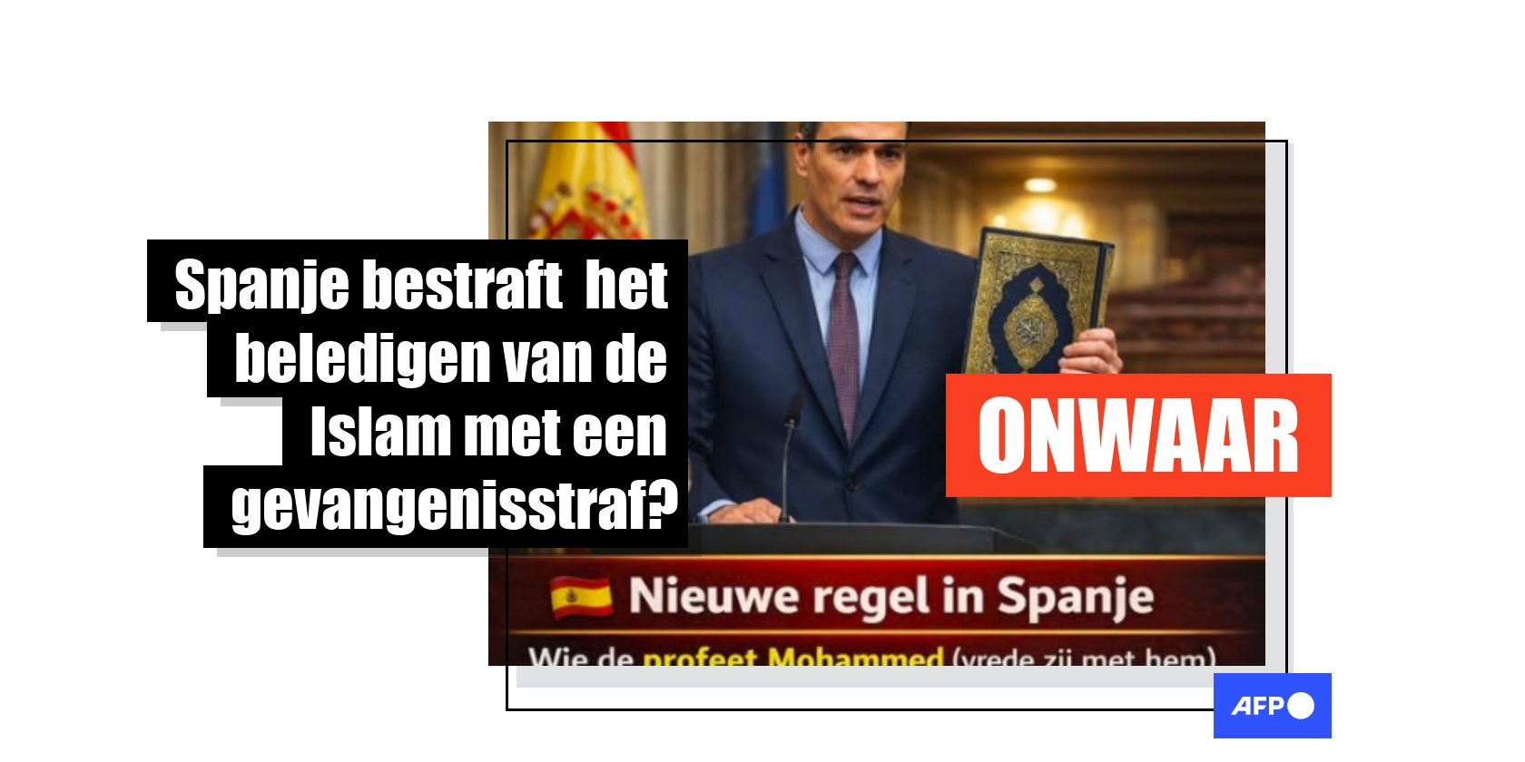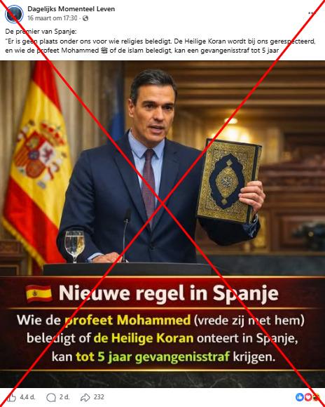 "De premier van Spanje: Er is geen plaats onder ons voor wie religies beledigt. De Heilige Koran wordt bij ons gerespecteerd, en wie de profeet Mohammed of de islam beledigt, kan een gevangenisstraf tot 5 jaar krijgen", luidt het Nederlandse bijschrift bij een Facebook- bericht dat op 16 maart 2026 online werd geplaatst.