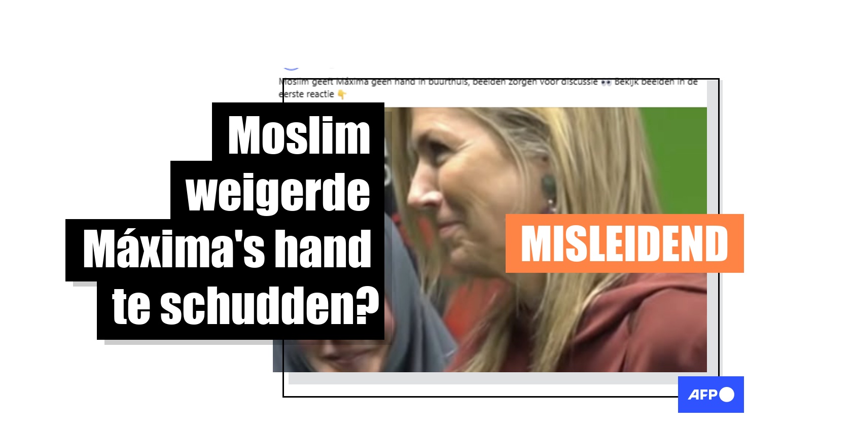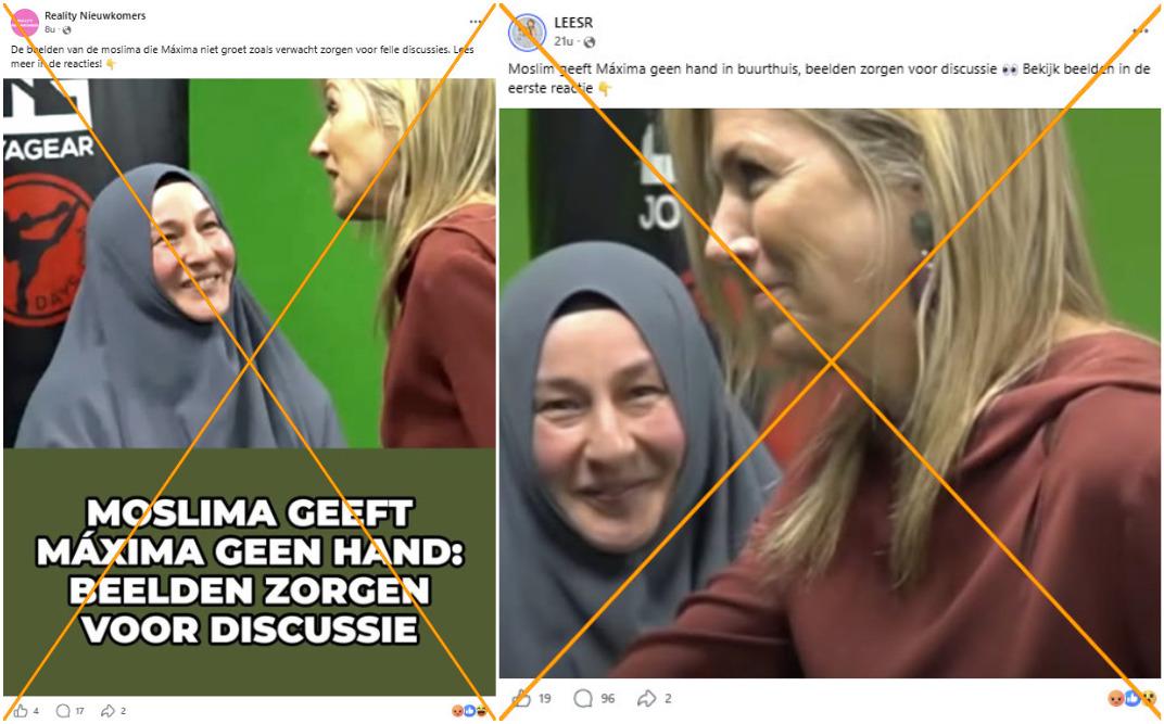 "De beelden van de moslima die Máxima niet groet zoals verwacht zorgen voor felle discussies", luidde het bijschrift van een van de Facebook-posts die op 10 april 2026 werden gedeeld. Bij de posts werd een foto gevoegd van Máxima die het buurthuis De Bol bezoekt in Amsterdam-Noord. Op de afbeelding is de koningin te zien en een vrouw in een grijze hijab die haar al lachend aankijkt.