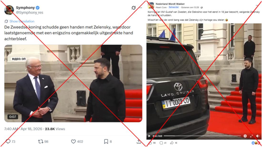 Vermeende minachting door vooraanstaande politici en staatshoofden tegenover de Oekraïense president Volodymyr Zelensky is een populair en terugkerend thema binnen pro-Russische kringen op sociale media. Zo circuleerde in april 2026 een video die zogenaamd laat zien hoe koning Carl XVI Gustaf van Zweden weigert Zelensky de hand te schudden tijdens een bezoek aan de Oekraïense stad Lviv. De opname werd echter gemanipuleerd en bewerkt. Foto's en video's van AFP ter plaatse laten duidelijk zien dat de twee mannen elkaar wel de hand schudden.
