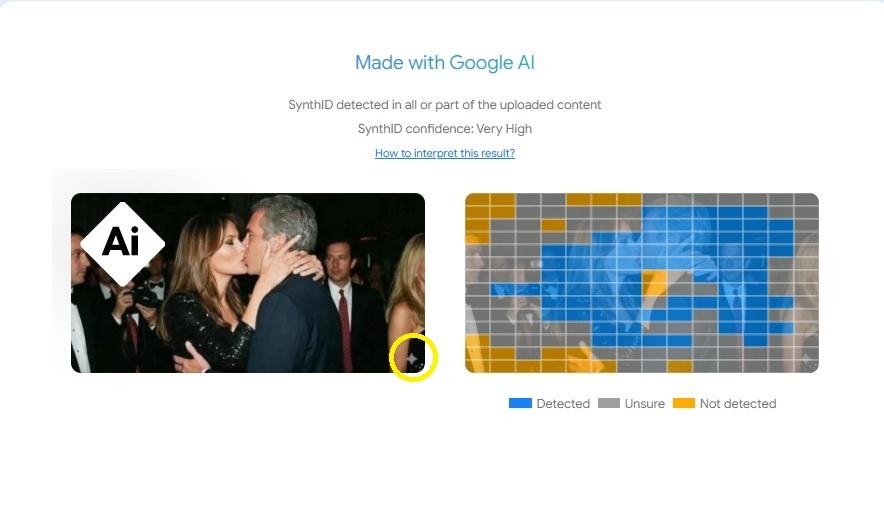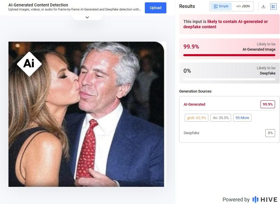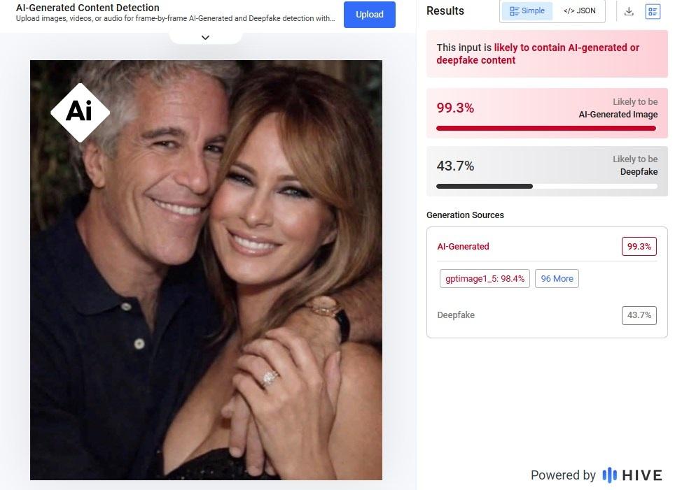 Op de afbeelding valt op dat Epsteins tanden er anders uitzien dan op echte foto's, zoals bijvoorbeeld te zien is op foto's van Getty Images uit 2000 en 2004. De AI-detectietool Hive Moderation gaf ook een waarschijnlijkheid van 99,3% aan dat het een creatie van kunstmatige intelligentie is, en specificeerde dat er een kans van 98,4% is dat de ChatGPT-generator is gebruikt.