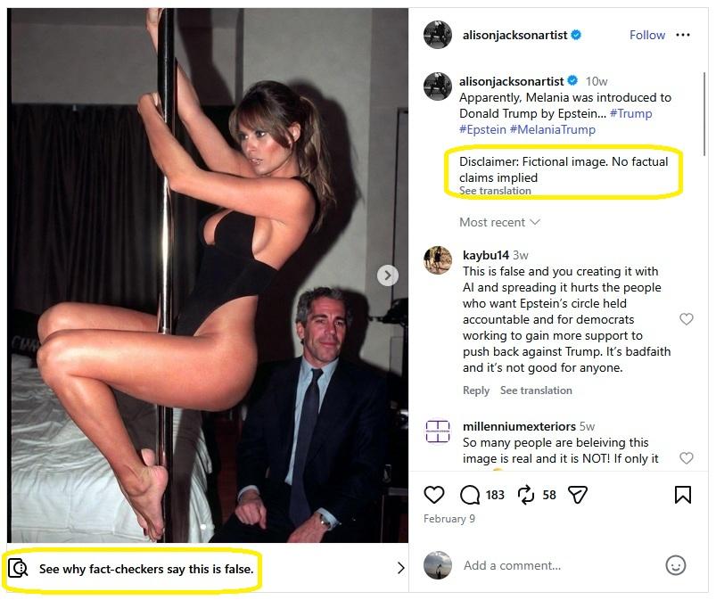 Met behulp van de factchecktool van Google ontdekten we dat deze afbeelding voor het eerst werd gepubliceerd op 9 februari 2026 op het Instagramprofiel van de Britse kunstenares Alison Jackson. Volgens de beschrijving op haar website maakt zij "overtuigend realistische foto's, films en sculpturen van beroemdheden in privésituaties". De afbeelding in kwestie bevat de volgende disclaimer: "Fictieve afbeelding. Geen feitelijke beweringen." Het bericht werd door factcheckers op Instagram als onjuist bestempeld.