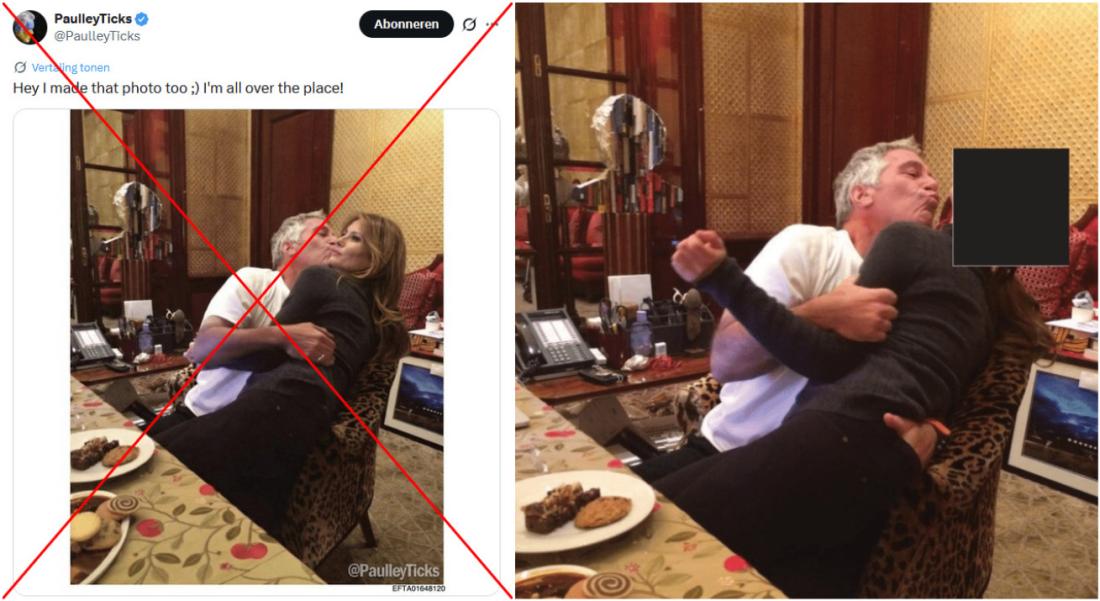 In zijn bericht staat onderaan een bestandsnaam die begint met EFTA, wat staat voor de "Epstein Files Transparency Act". Dit wijst erop dat de afbeelding gebaseerd is op een echte foto uit de Epstein-archieven. Door te zoeken op het label "EFTA01648120" vonden we de originele afbeelding terug, waarop te zien is dat Epstein een vrouw kust die onherkenbaar is gemaakt om haar identiteit te beschermen.